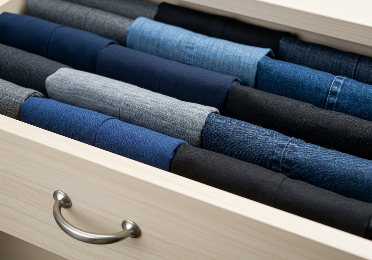 바지나 스커트 같은 하의는 부피가 작으면서도 형태가 잘 유지되는 편이기 때문에, 다음과 같은 방식으로 수납이 가능합니다: